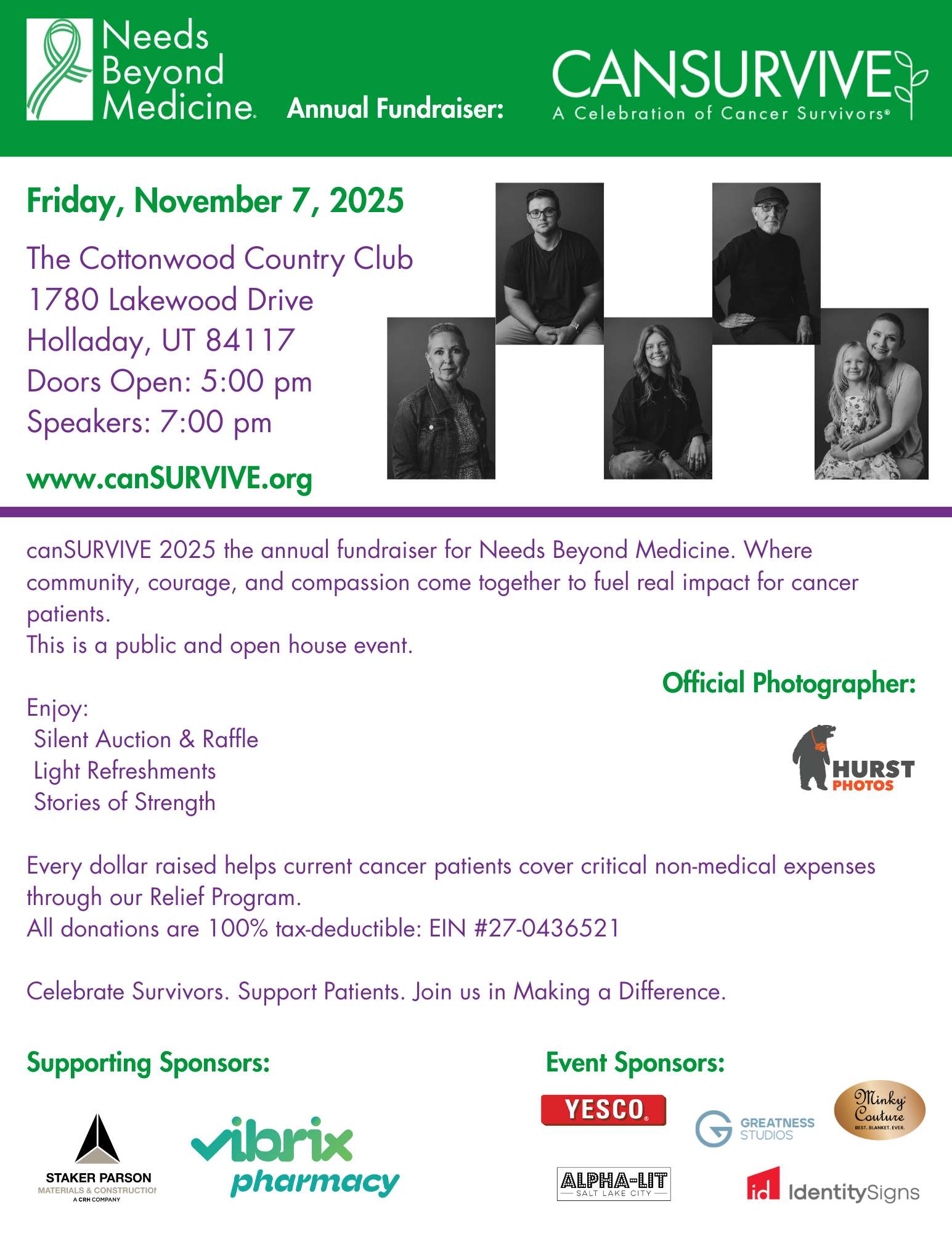 canSURVIVE is Needs Beyond Medicine’s signature annual fundraiser, a tradition held every November since its inception in 2009. This unique event takes the form of a photo gallery stroll, featuring portraits of cancer survivors from the Utah area. Each survivor's portrait is accompanied by their personal story, providing a powerful narrative of how they triumphed over this formidable disease. Participants in previous years have shared their experiences, offered words of advice to the public, or conveyed quotes that inspired them on their journey.